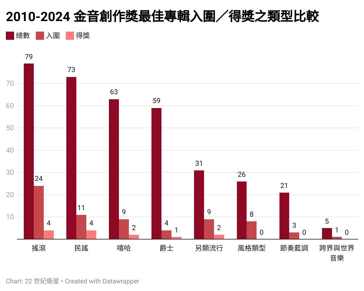 以下我們就來看看,金音獎從第一屆到去年共 15 年之間入圍各類型音樂獎項的專輯,最後進入不分類型的最佳專輯獎時會產生什麼樣的比例變化。在下面圖表中,「總數」指的是入圍該類型的專輯數量,而「入圍」和「得獎」則是指這些專輯進入最佳專輯獎評選的結果。